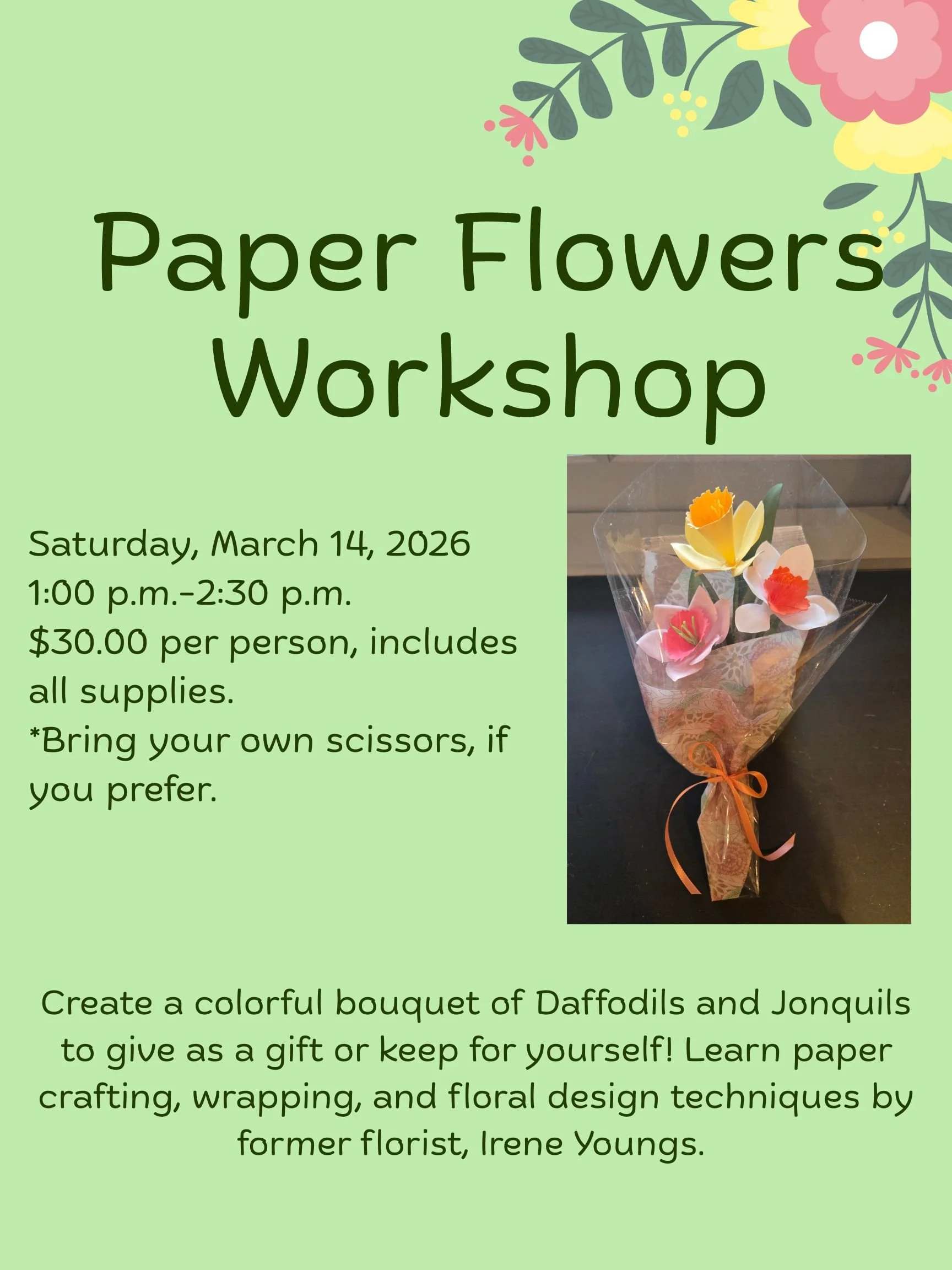 Back to All Events Paper Flowers Workshop Saturday, March 14, 2026 1:00 PM 2:30 PM Locust Grove Estate 2683 South Road Poughkeepsie, NY, 12601 United States (map) Google Calendar ICS To purchase tickets: https://www.eventbrite.com/e/paper-flowers-workshop-tickets-1984159212617?aff=oddtdtcreator